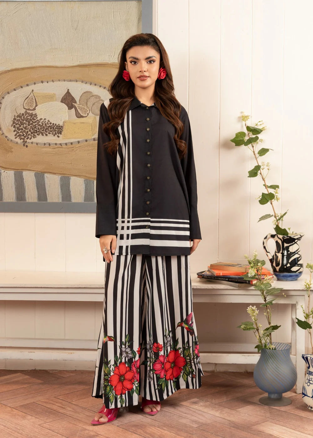 Black Stripe Top & Bottom. This combination creates a sophisticated and fashionable look. The black stripe top adds a classic touch, while the flared pants with floral and printed details introduce a dynamic and eye-catching element. These pants are flared fitted through the hips and thighs and then flare out.